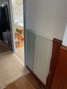 Bara fortsatt måla. Testade en mörkare nyans på panelen. Blir mycket bättre. Men skulle nästan kunna vara ännu mörkare. Hmm… Men det får nog duga med den här. Det blir ljusare i hallen och man kan ana smaken av GB-glass 🙂 Svalkande.