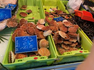 Och så matlagning, halstrade och fixade råa pilgrimsmusslor. Vi hade köpt tre kilo för 20€ så det var 21 musslor att göra i ordning.