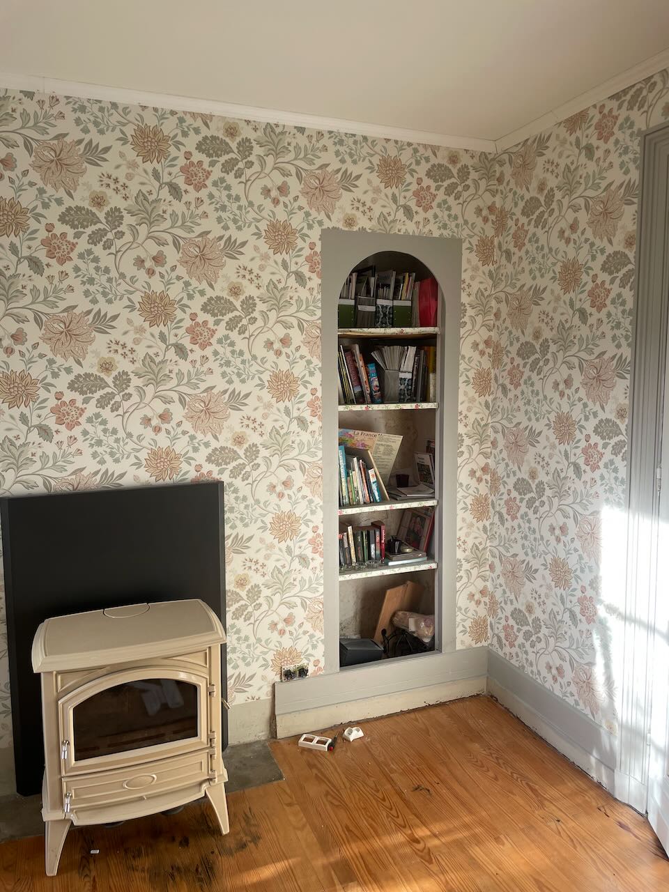 Fortsatt tapetsera i matrummet och gjorde klart det sista. Satte upp taklister också. Nu ska de bara spacklas och sedan målas igen.