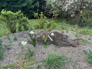 Fika ute och så lite trädgårdsfixande. Hade köpt en forsythia och en prakttry som vi planterade dels i buxbomscirkeln och vid muren mot Martine.