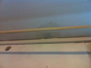 Borrat fem av de nio hål som ska hålla fast regeln som ska sitta i kökstaket där gamla väggen satt.