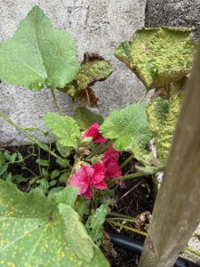 En liten stockros! Jippee! Men den har inte fattat att den ska bli typ 1-2 meter hög. Den här är 30 cm hög ungefär.