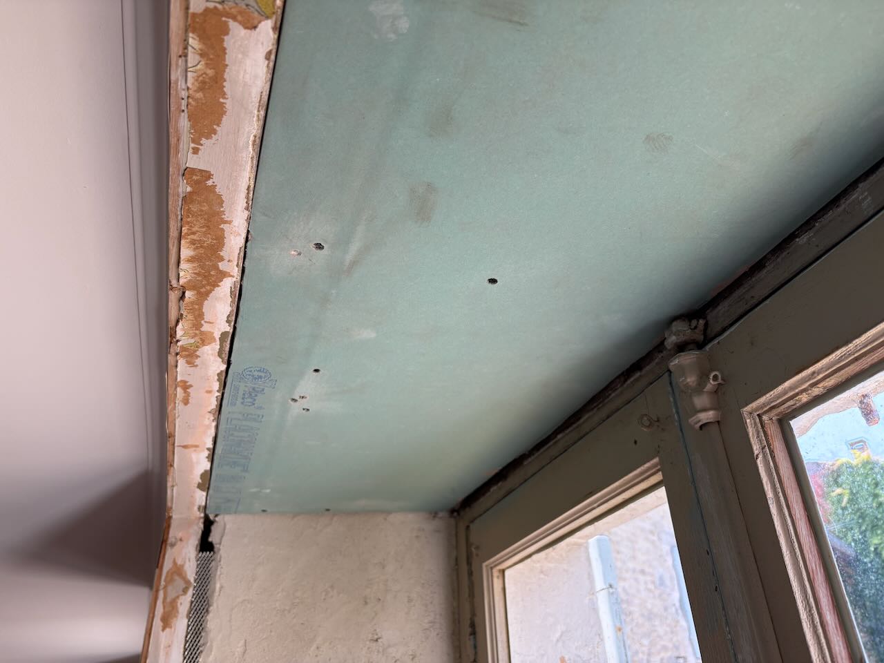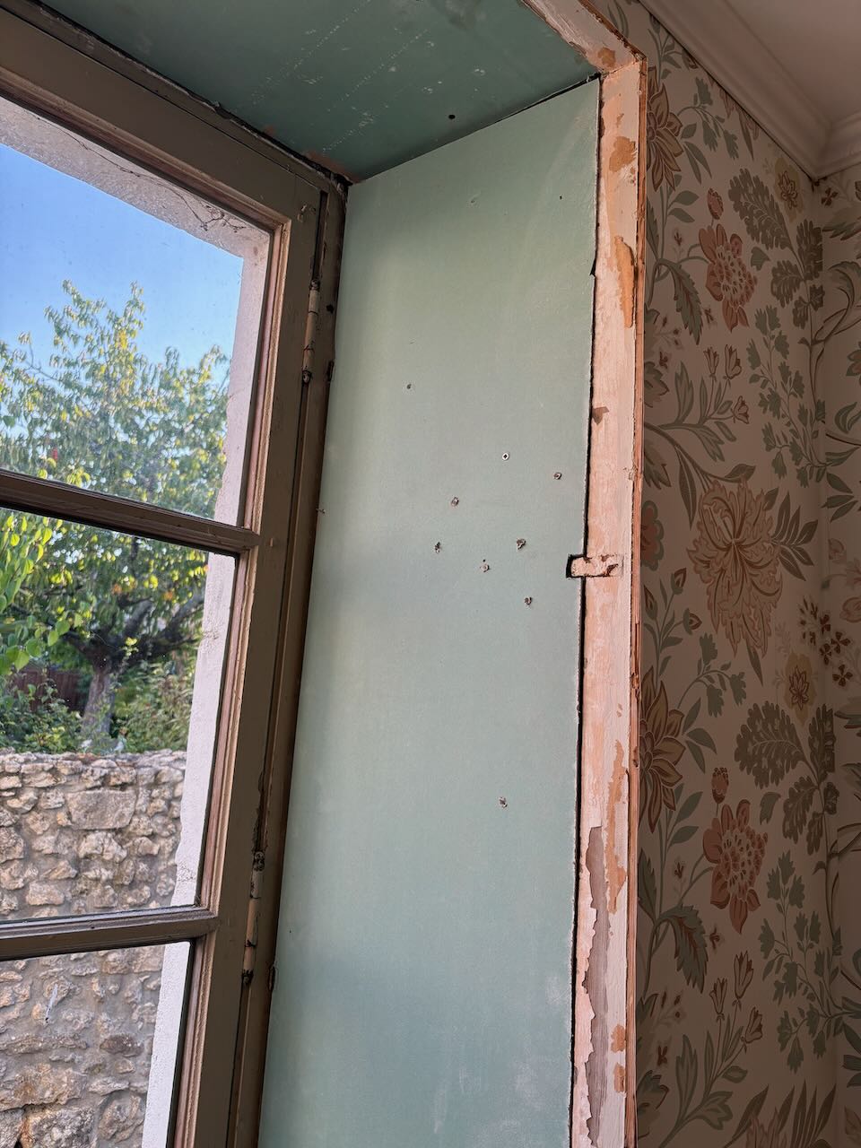Idag har jag fixat lite i trädgården och påbörjat en av fönsternischerna i matrummet. Översta gipsskivan var okey att sätta dit för där finns det ju trä bakom att fästa den i. Gipsskivan på sidan var mycket svårare eftersom det bara är sten där bakom. Om än mjuk sandsten är den svår att få något att fästa i. Så jag kommer ha några enstaka skruvar som jag lyckats få att fästa i stenen samt lister runt om som får hålla skivan på plats.