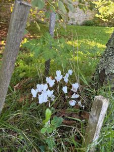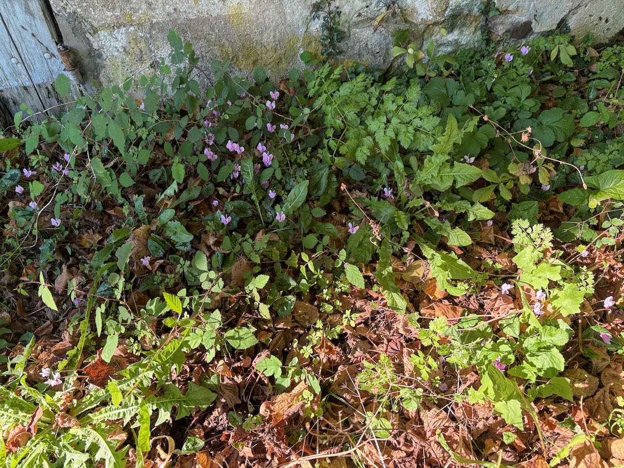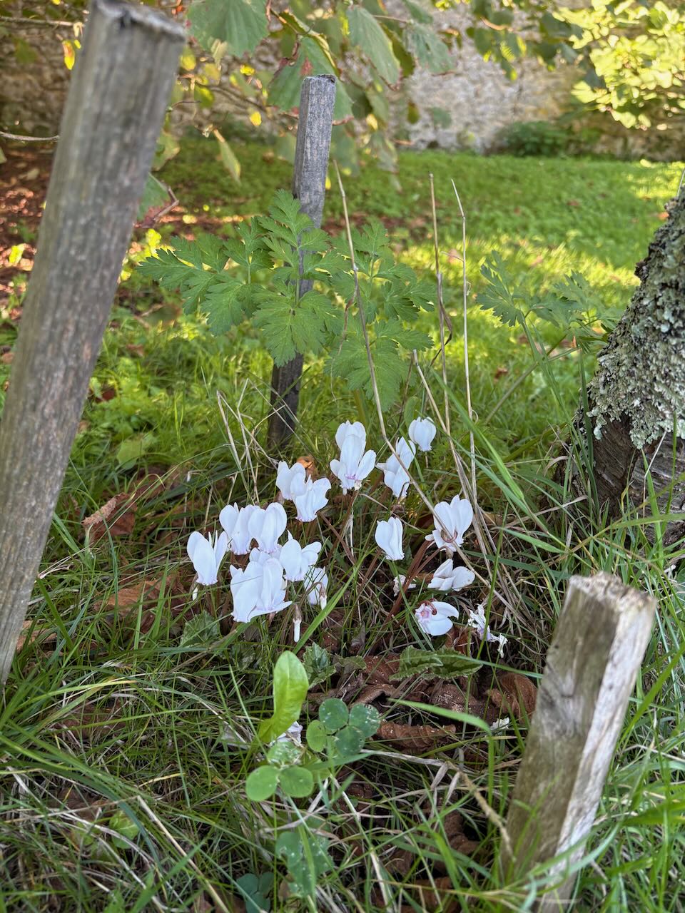 Det finns en del cyklamen, dels vid uthuset men också ute i gräsmattan vid ett gammalt persikoträd.