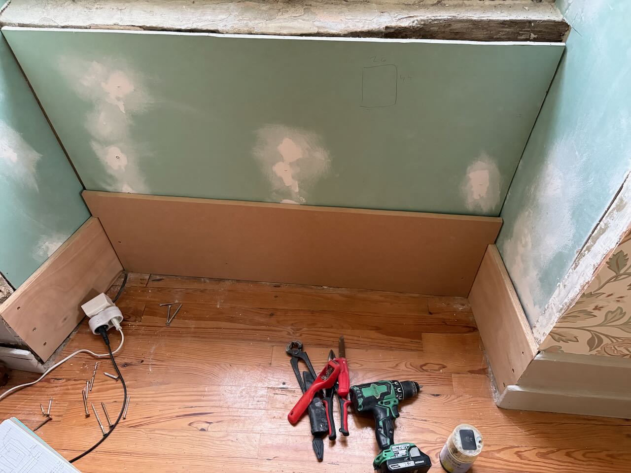 Börjat fixa med fönsternischen i matrummet. Svåraste delen är ju övergången från befintligt till nytt. Så jag började med listerna längst ner. Lite pyssel.