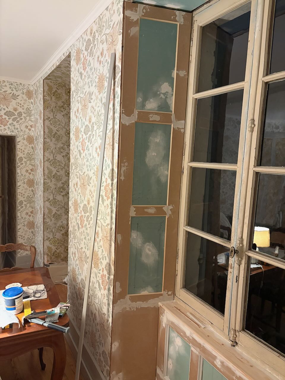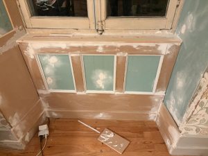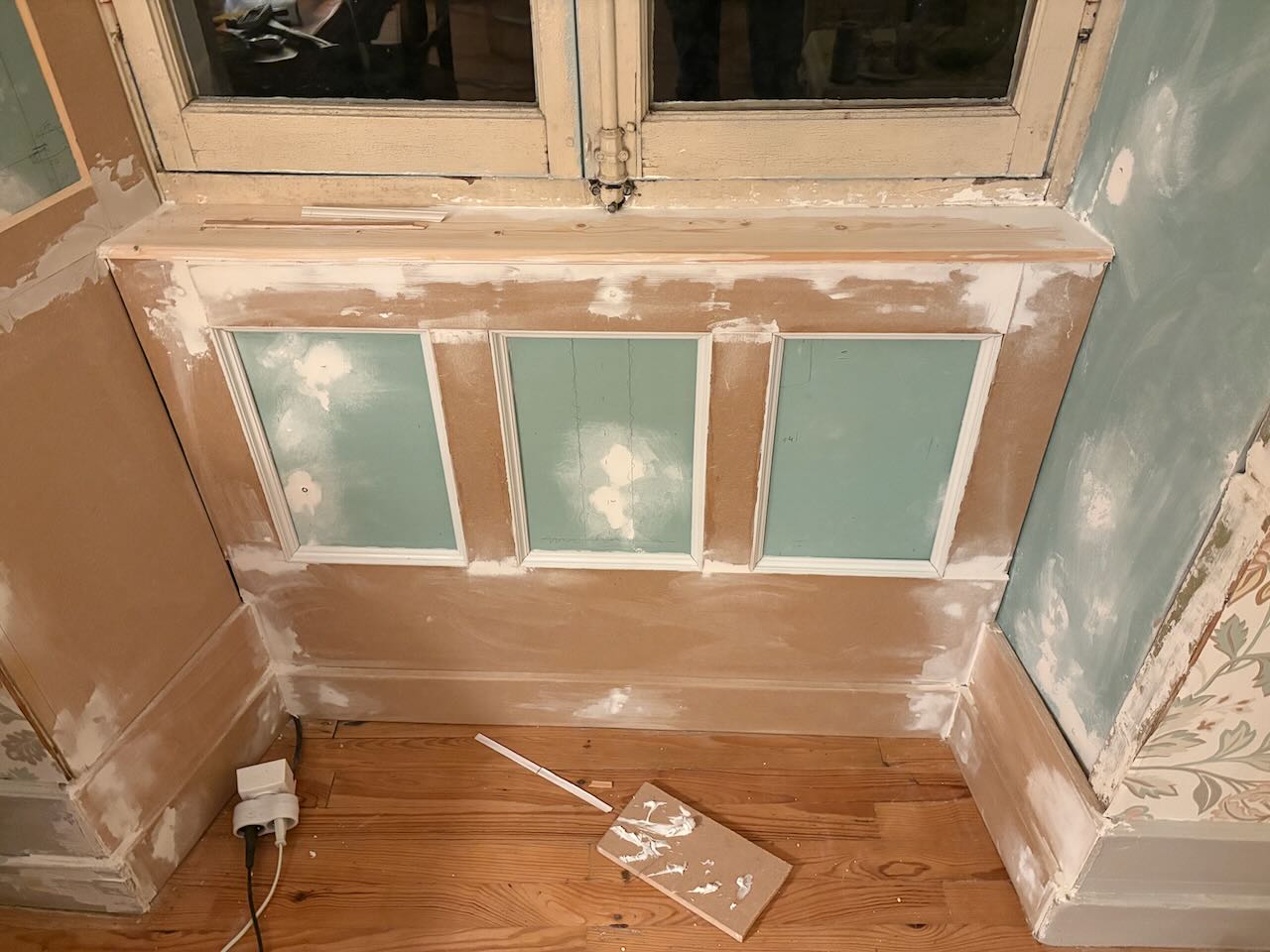 Jag har fortsatt med fönsternischen förstås. Nu har speglarna under och bredvid fönstret fått sina yttre delar klara.