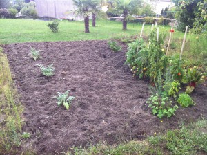Lite regn när vi kom ner men varmt. Trädgården är rätt frodig kan man säga. Grannen Georges har jobbat hårt i landet och utvidgat det.