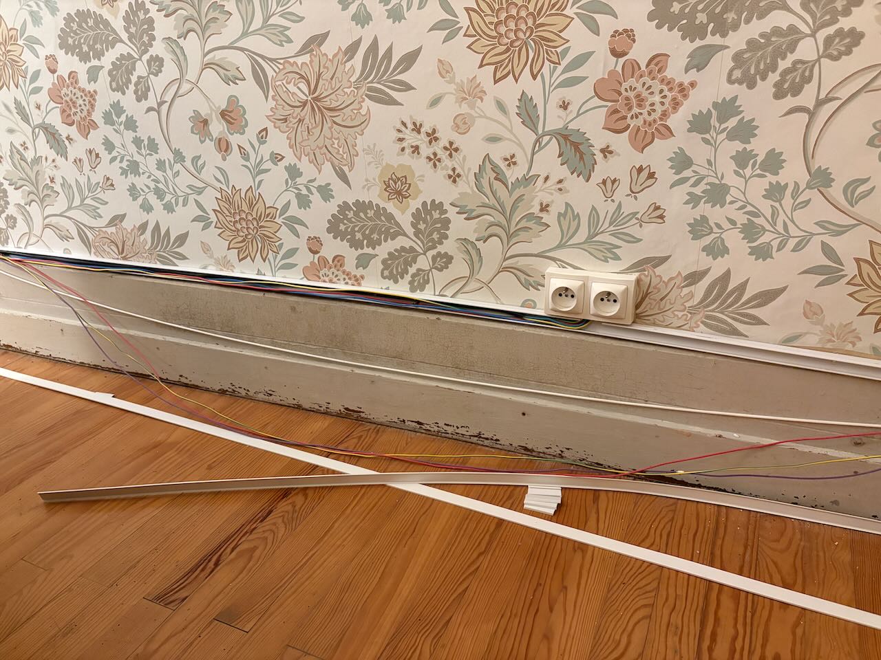 Har även börjat med att fixa det sista med elen i matrummet. Bakom soffan har det hängt en massa sladdar som ska in i en kabelkanal. Och så ska sockeln målas mörkgrå. Eftersom det varit bakom soffan har man inte sett det och jag har prioriterat bort det.