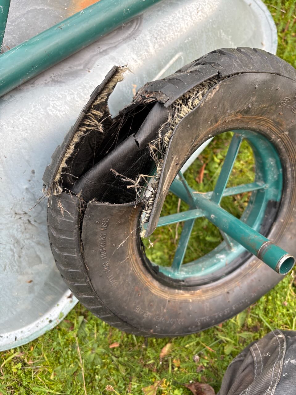 Försöker byta däcket på skottkärran. Inte helt lätt att få bort det gamla däcket. Nästan enklare att köpa ny skottkärra 😮 .