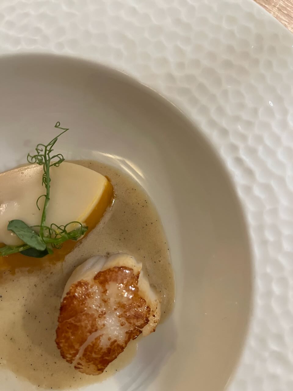 Middag på Auberge de Cercoux. Väldigt gott men lite långsamt. En liten amuse-bouche med pilgrimsmussla: