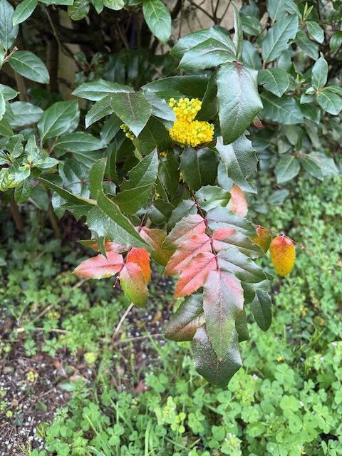 Bild på en blomma som jag hittade igår. Tror inte jag sett den tidigare? Eller inte på den platsen. Nu är det under busken som växer i hörnet på garaget med vita blommor som blommar på vintern (lagerolvon?). Den ”nya” gula är Berberis av någon sort enligt PlantNet.