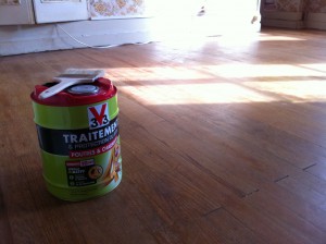 Trämaskutrotaren kom hit och levererade en liten överraskning. Han har inte alls behandlat allt trä i huset, bara det trä som hade aktiva angrepp, dvs golvet i matsalsrummet är inte behandlat. Han tyckte vi kunde göra det själv så vi tog en tur till Bricomarché och köpte lite utrotningsmedel. Så i morgon ska jag pensla på det på golvet i matsalsrummet. Lite halvgiftigt så det är bra att göra det precis innan man åker.