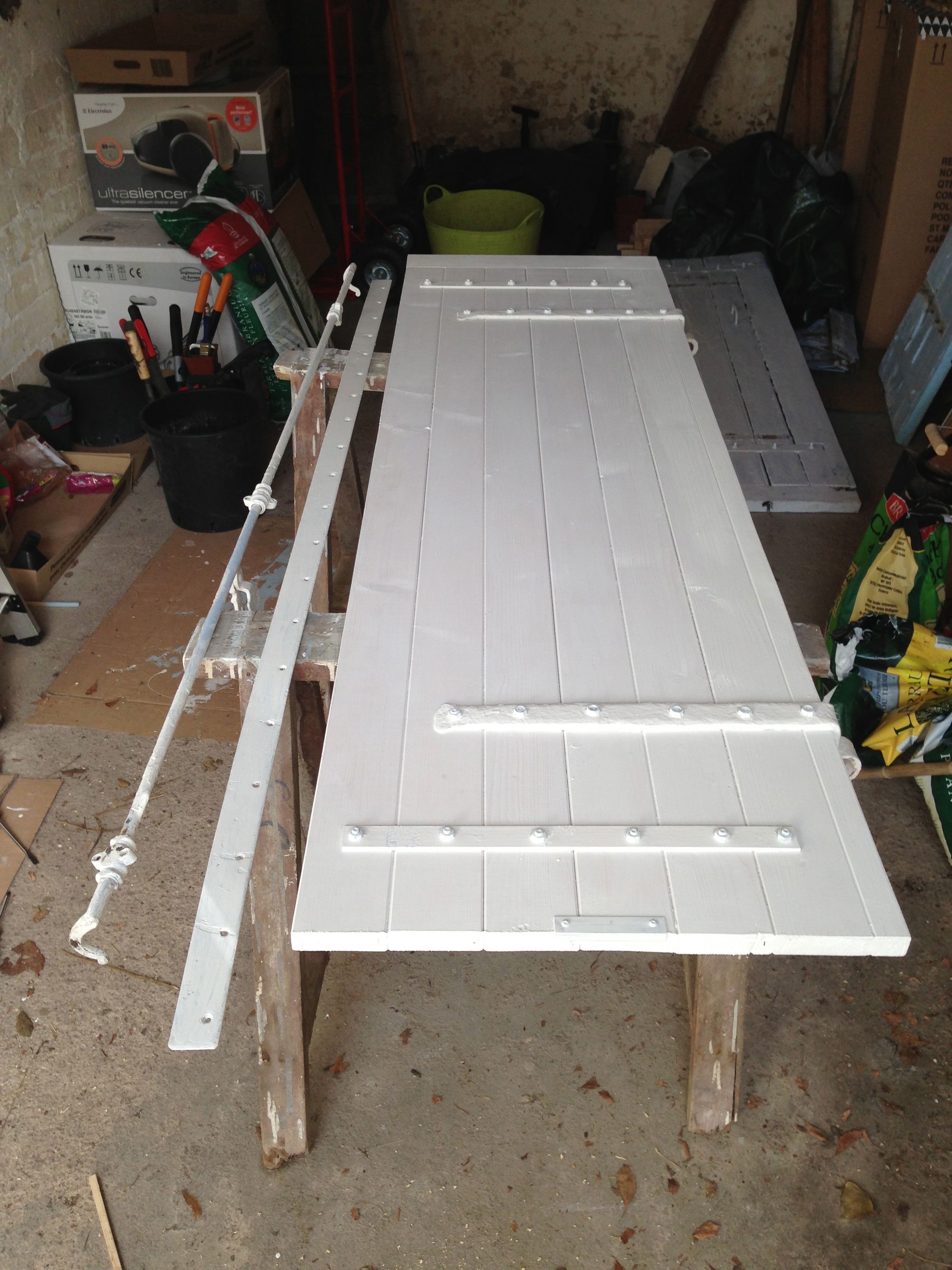 Fixade med fönsterluckan. Satt på gångjärn och hängt den på plats. En hel del slipande för att få den att passa bra. Och så grundmålande igen efter slipandet. Nu ska bara de andra delarna på plats också.