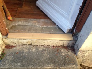 Har börjat fixa med tröskeln till ytterdörren men det kommer behövas mycket slipande för att få den att passa.